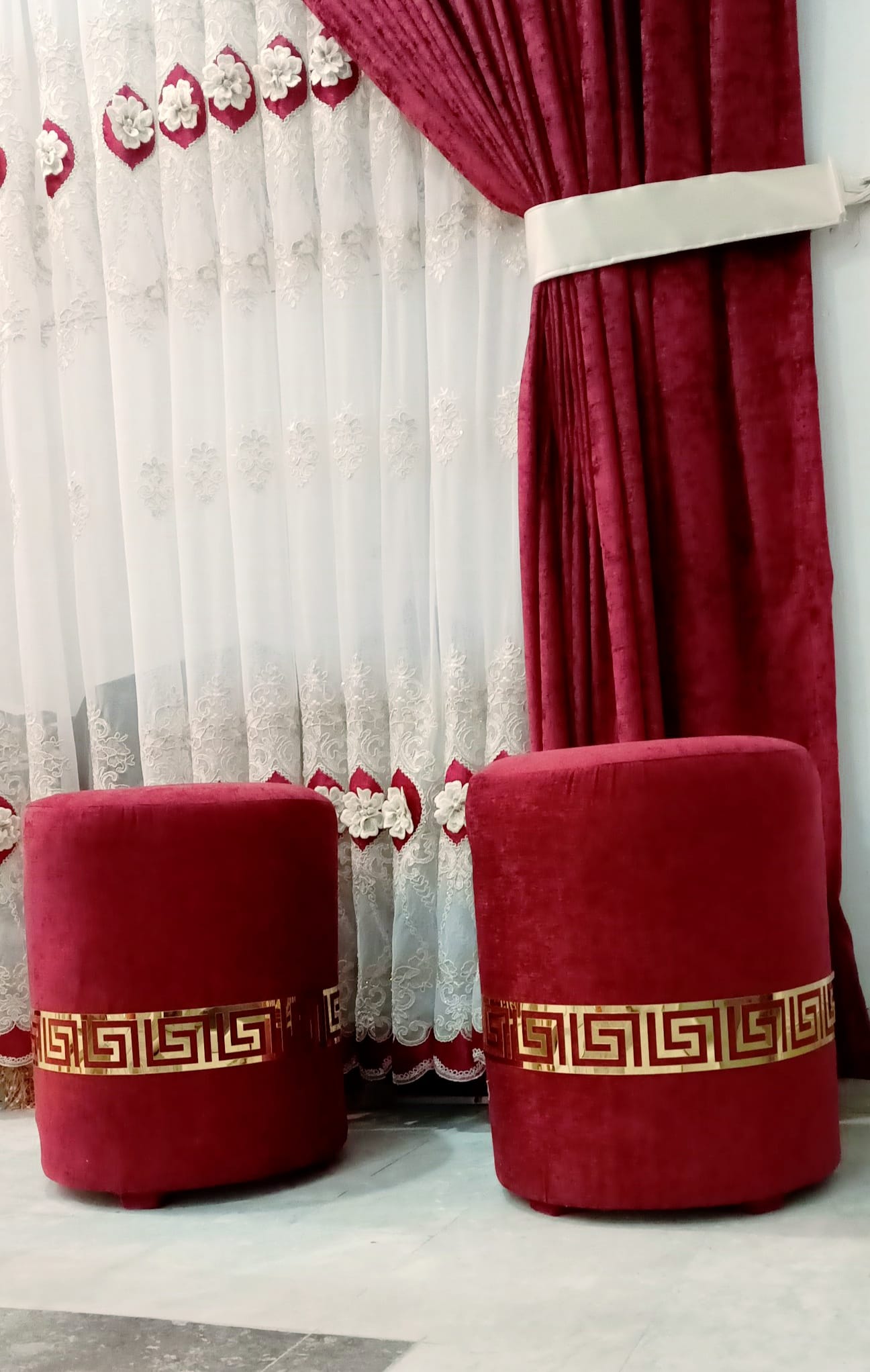 The elegant embroidered detailing on the white inner curtains showcases refined floral patterns, adding charm and depth to the overall design. Matching tiebacks ensure a neat and graceful drape, making the curtains ideal for both modern and classic interiors. Whether installed in a living room, drawing room, majlis seating area, or formal lounge, this curtain set instantly elevates the visual appeal of any space.