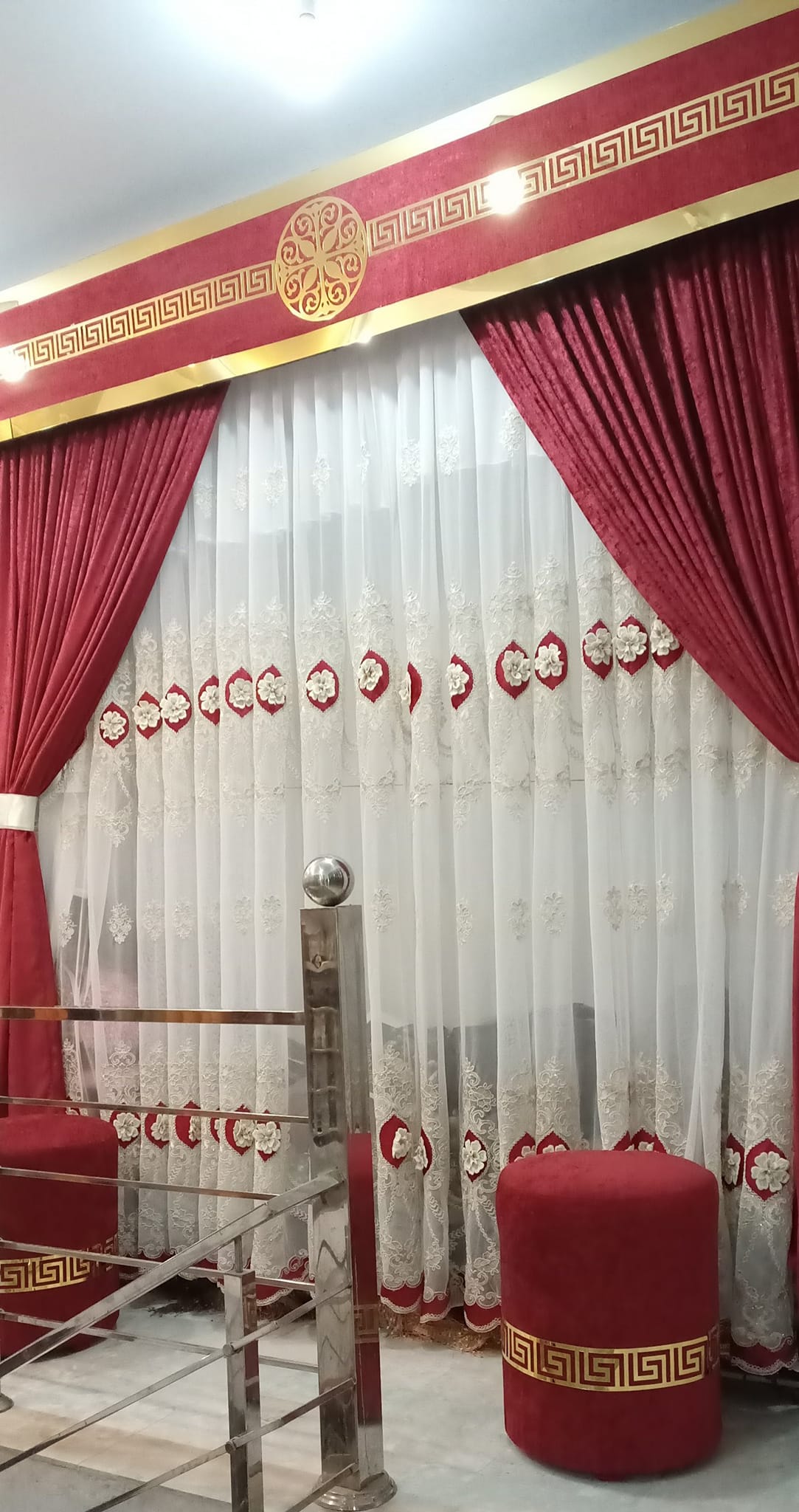 Luxury Maroon & White Embroidered Curtain Set with Decorative Valance